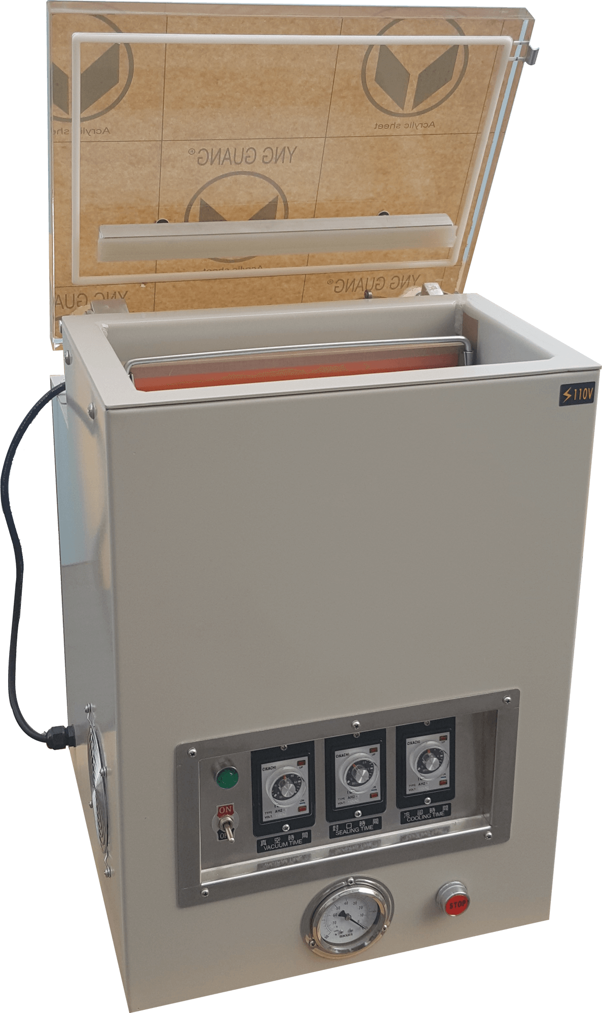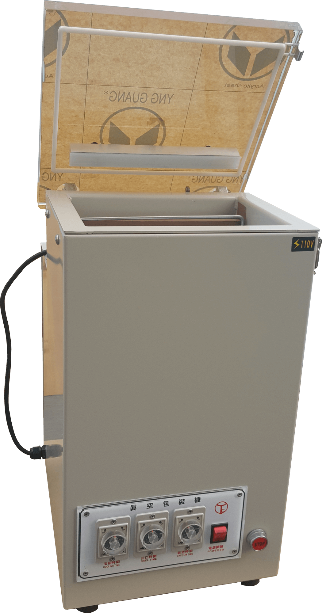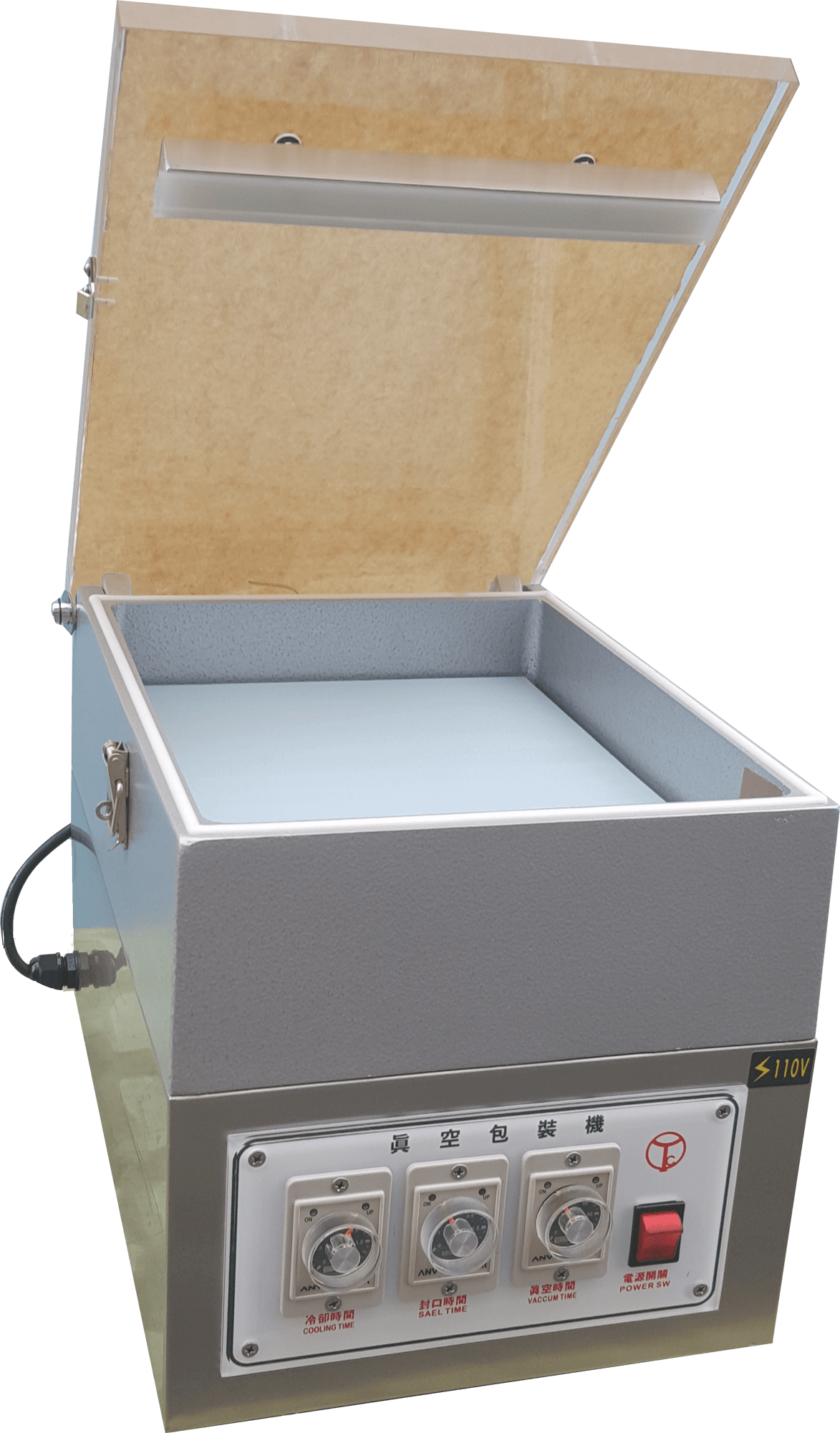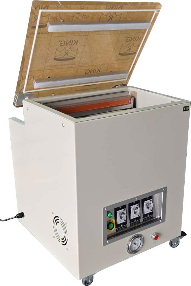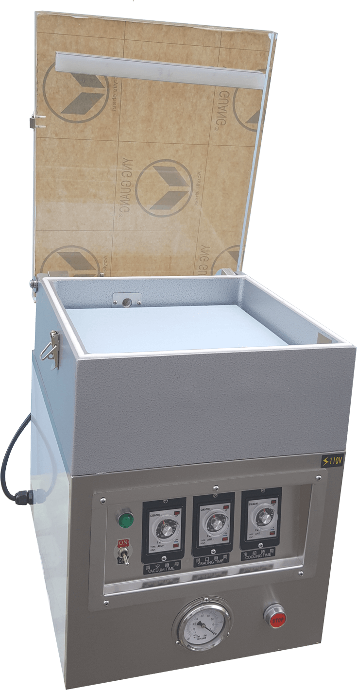HC-601(aluminum chamber) Power supply single phase110V vacuum pump 6m3/hr machine size 480 x 400 x 500H(mm) vacuum size 340 x 330 x 120H(mm) sealing bar length 310mm x 1 machine net weight 58kg machine material machine body-stainless*304 chamber -Aluminum