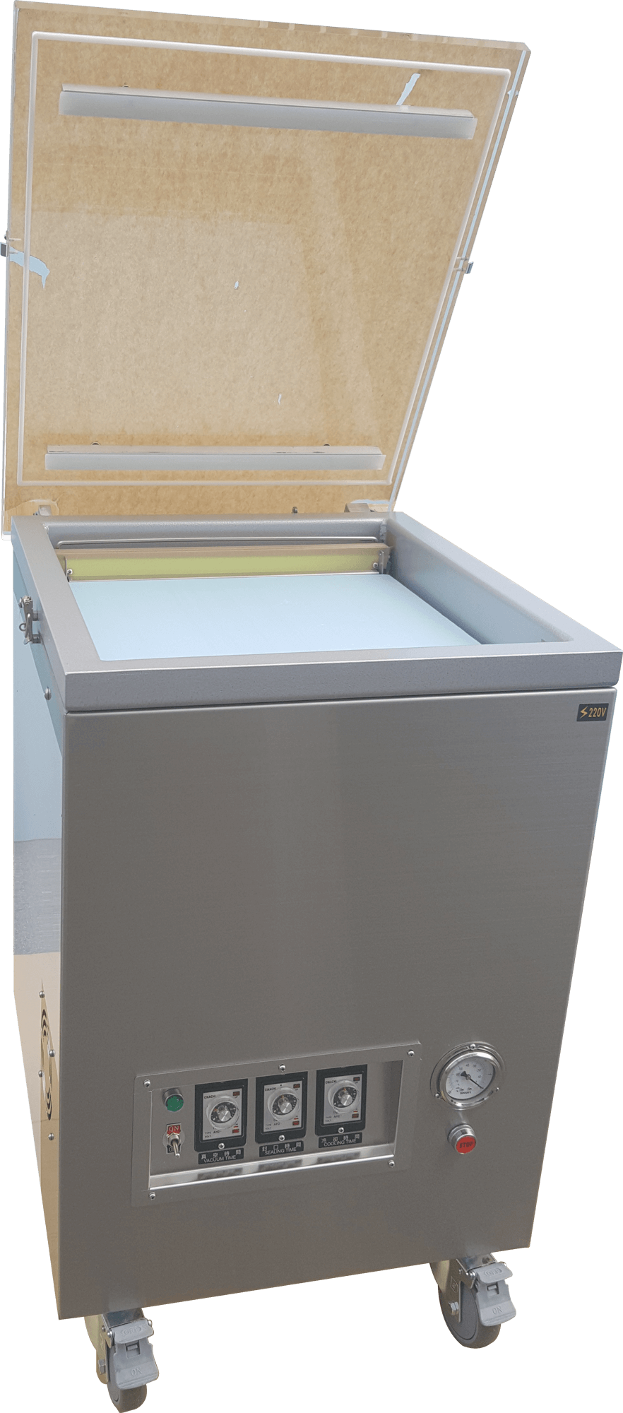 HC-2kg(aluminum chamber) Power supply single phase110V vacuum pump 4m3/hr (600g tea bag. 2bags once) machine size 440 x 300 x 330H(mm) vacuum size 330 x 260 x 100H(mm) sealing bar length 250 mm x 1 machine net weight 28kg machine material machine body-stainless*304 chamber - coated steel -